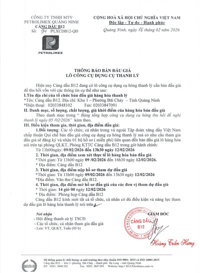 Nguồn: Petrolimex Quảng NinhCảng dầu B12