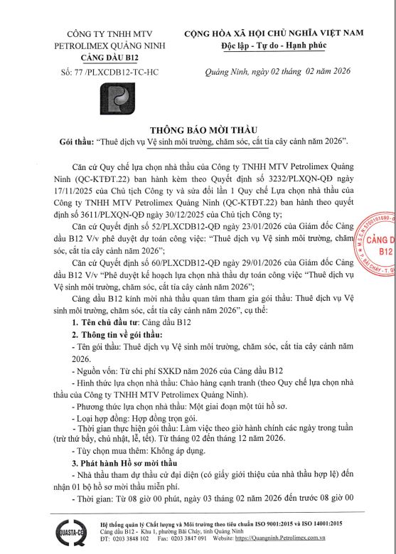 Cảng dầu B12 thông báo mời thầu - Gói thầu: Thuê dịch vụ Vệ sinh môi trường, chăm sóc, cắt tỉa cây cảnh năm 2026