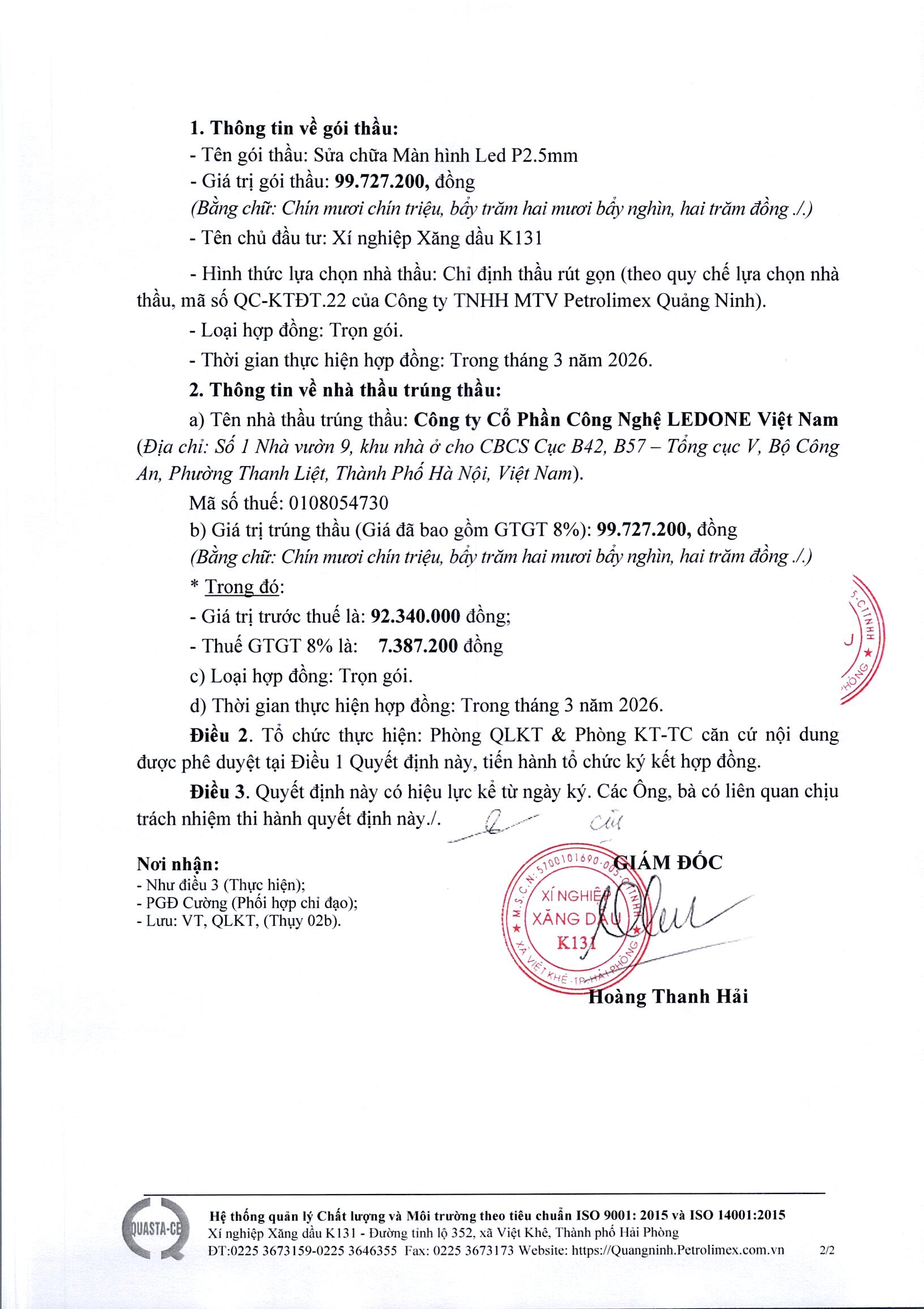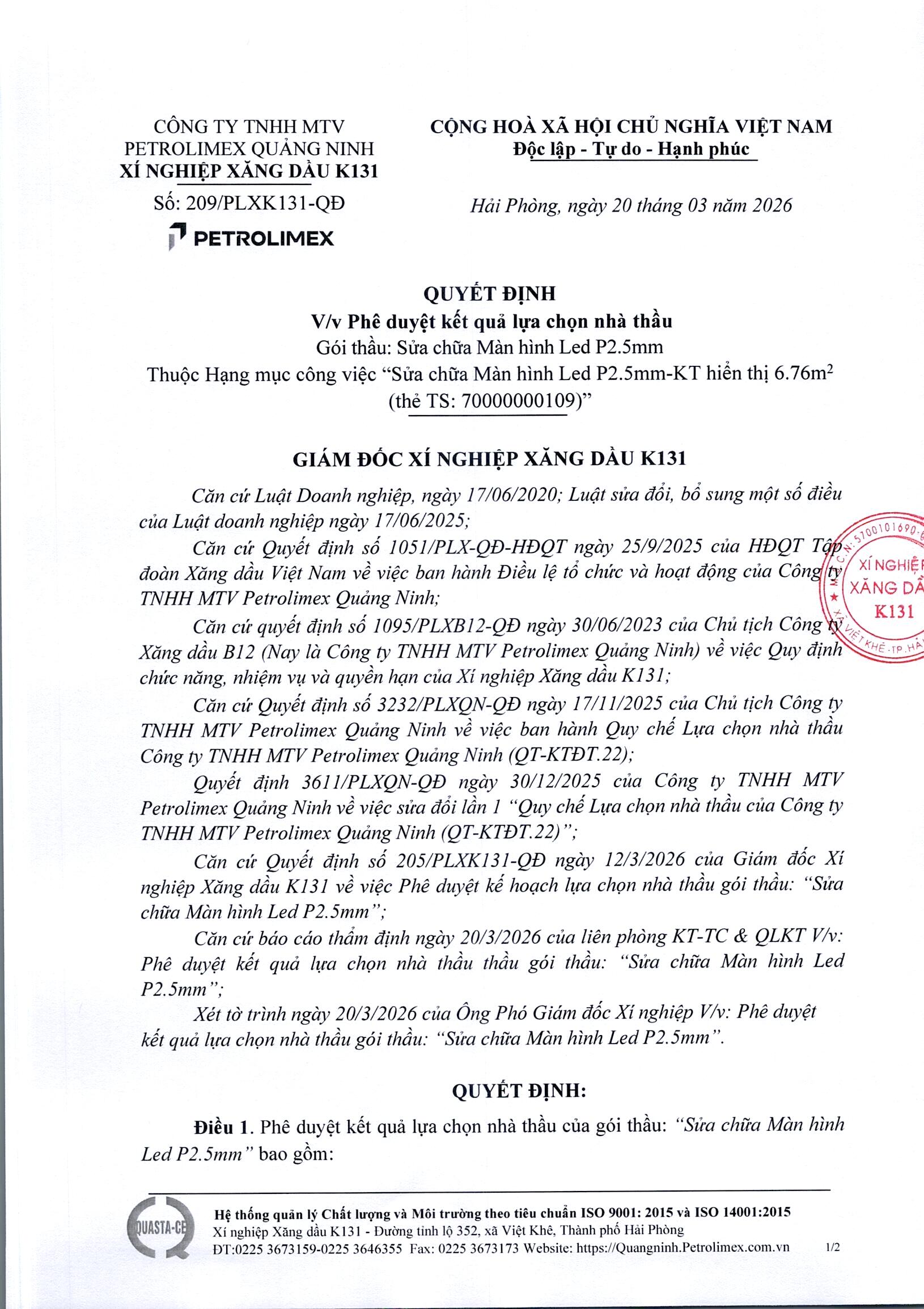 Xí nghiệp Xăng dầu K131 Quyết định Phê duyệt kết quả lựa chọn nhà thầu Gói thầu: "Sửa chữa Màn hình Led P2.5mm"